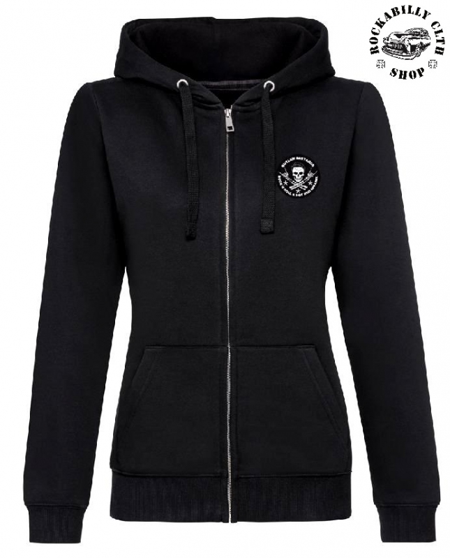 100% bavlněná černá dámská mikina Outlaw Bastards na zip s kapucou, vpředu kapsa "klokanka".