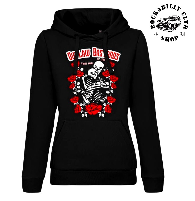 Originální a stylová dámská černá mikina Outlaw Bastards, vpředu s kvalitním potiskem Outlaw Bastards, 100% bavlna, vpředu kapsa "klokanka" , motiv love, lebky, růže