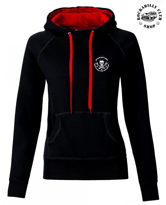 Originální a stylová dámská černo červená mikina Outlaw Bastards, vzadu s kvalitním potiskem, vpředu nášivka Outlaw bastards, 100% bavlna, červený vnitřek v kapuce, červené šňůry, vpředu kapsa "klokanka"