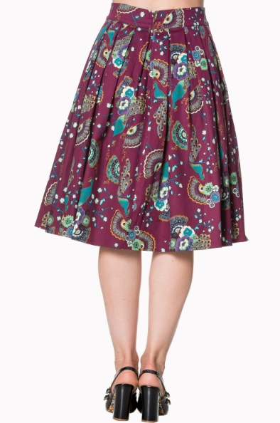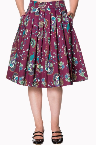 Sukně dámská s kapsami značky Banned , motiv retro, rockabilly, pin-up, letní, páv, barva fialová.