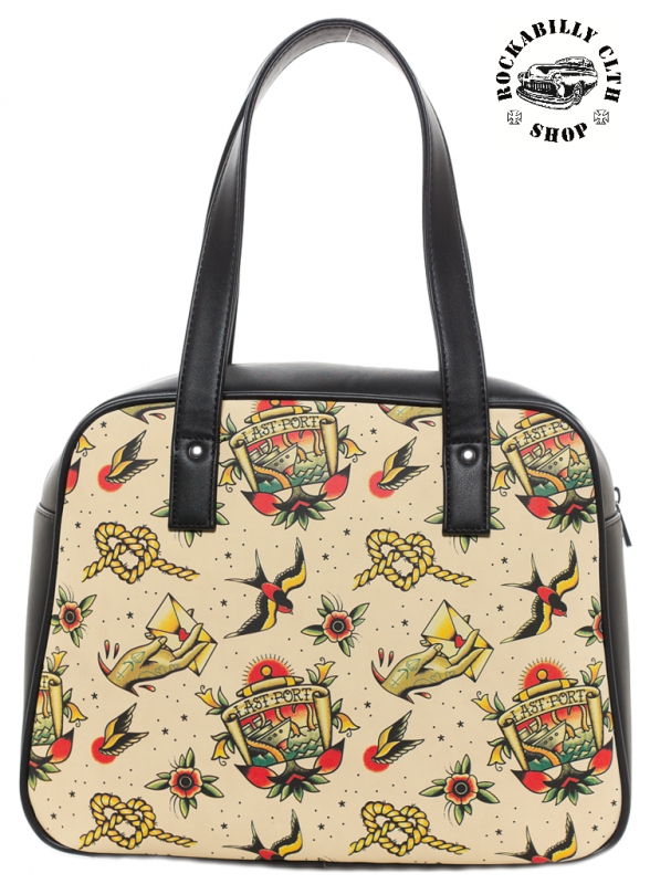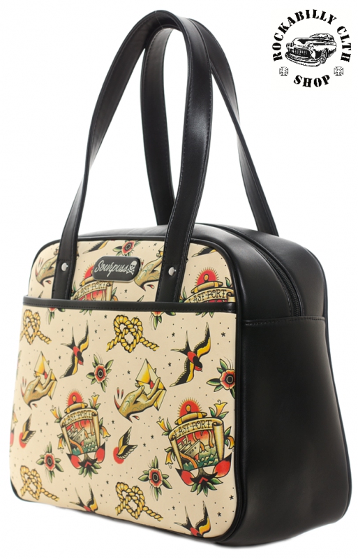 Velká exkluzivní kabelka značky Souprpuss na zip, šířka 34 cm, výška 28 cm, délka ucha 25 cm, vpředu jedna kapsa zapínací, uvnitř 3 kapsy z toho jedna na zip. Lze jako doplněk k rockabilly, rock ´n ´roll, hot rod, chopper stylu. Dodává Rockabilly Clothing Shop Praha. Barva černá, motiv old school tattoo, námořnický.