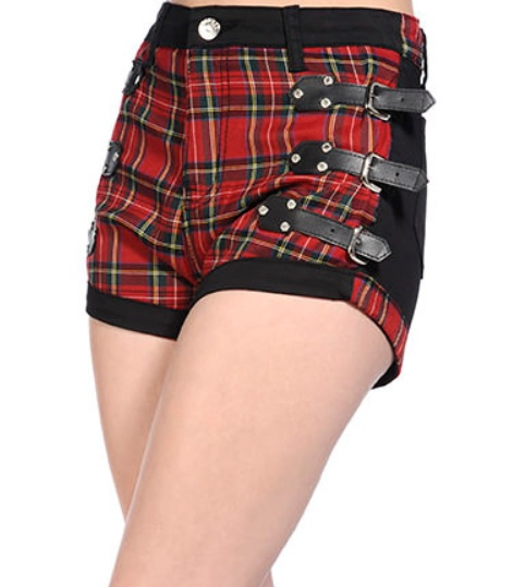 Dámské kraťasy Banned s přezkou, tartanovým designem, s řemínky s přezkou z umělé kůže na přední straně. Zadní kapsy jsou černé a zadní část kraťasů je také zdobena tartanem. Zapínání na zip. Ve spojení s ležérním topem, trikem či tílkem budou vypadat báječně. Jsou vyrobeny z bavlny a elastanu.
