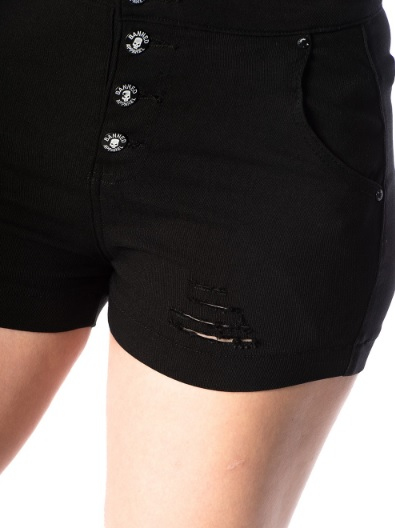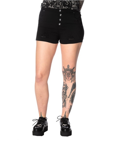 Dámské černé kraťasy Banned, dodá Rockabilly clothing shop www.rocka.cz. 2 zadní kapsy, zapínání na zip. Ve spojení s ležérním topem, trikem či tílkem budou vypadat báječně. Jsou vyrobeny z bavlny a elastanu.