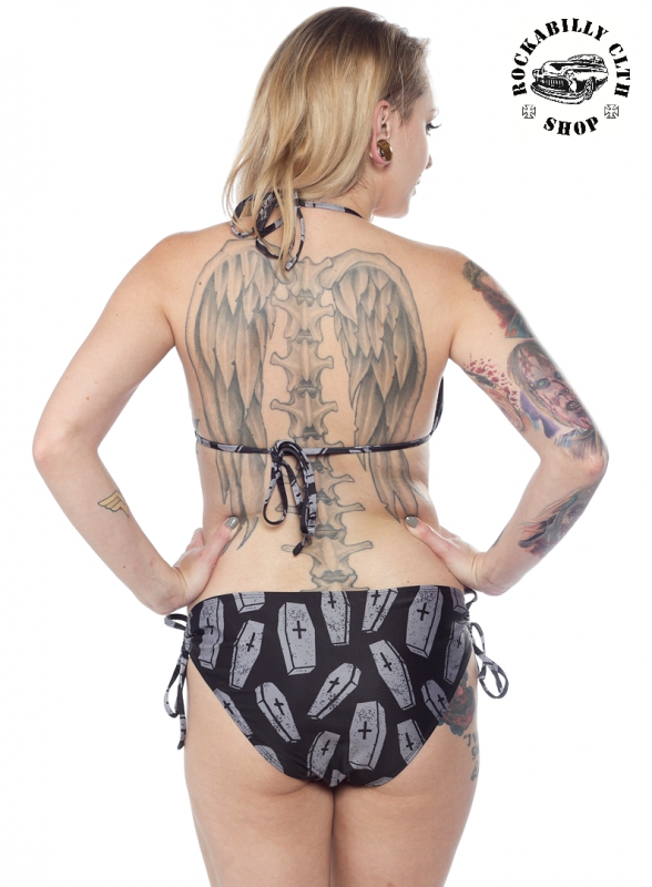 Dámské exkluzivní dvoudílné plavky - bikini Sourpuss Clothing z Ameriky, barva černá , motiv horror, rakve ..... ty prostě musíš mít ! Dodává Rockabilly clothing shop www.rocka.cz