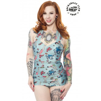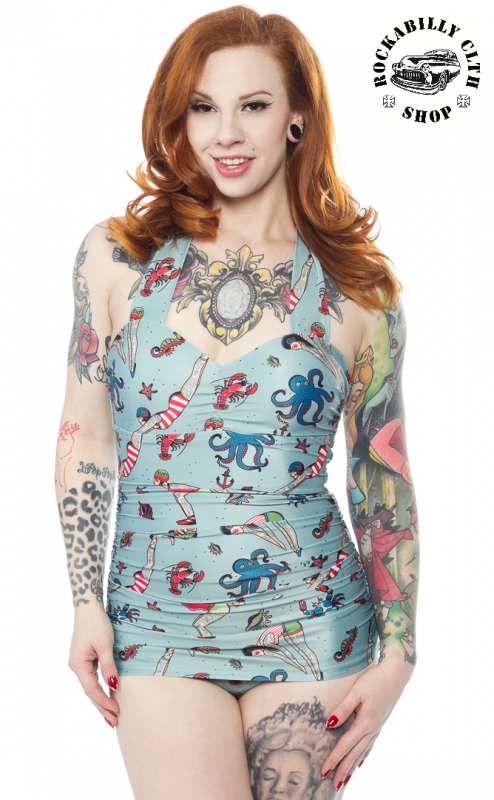 Dámské exkluzivní jednodílné plavky Sourpuss Clothing z Ameriky, barva modrá , motiv oldschool tattoo ..... ty prostě musíš mít ! Dodává Rockabilly clothing shop www.rocka.cz