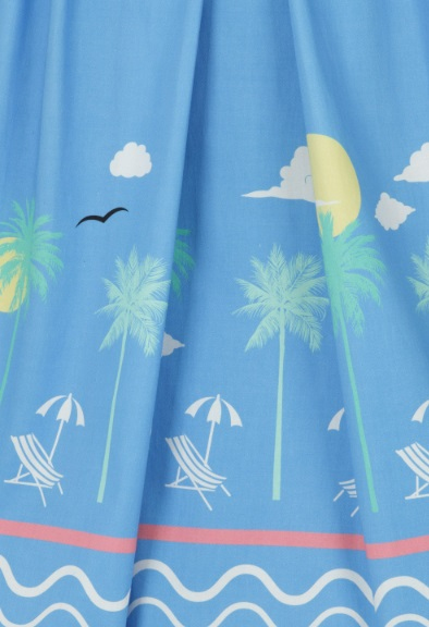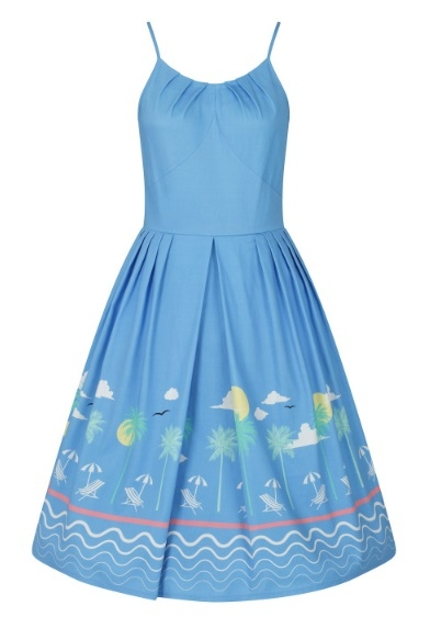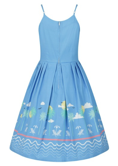 Dámské stylové bavlněné šaty s kapsami značky Banned, barva modrá, retro, rockabilly, pin-up, motiv romantický, plážový, letní..... ze zadu knoflíčky pro snadnější oblékání. Dodává Rockabilly clothing shop www.rocka.cz