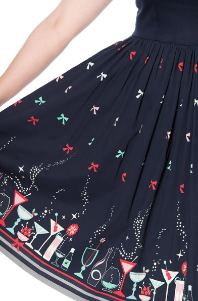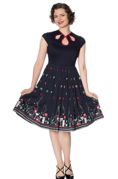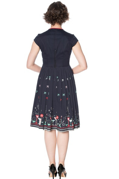 Dámské stylové bavlněné šaty značky Banned, barva modrá navy, retro, rockabilly, pin-up, motiv drinky, mašličky, kvězdičky..... na zádech zip pro snadnější oblékání. Dodává Rockabilly clothing shop www.rocka.cz