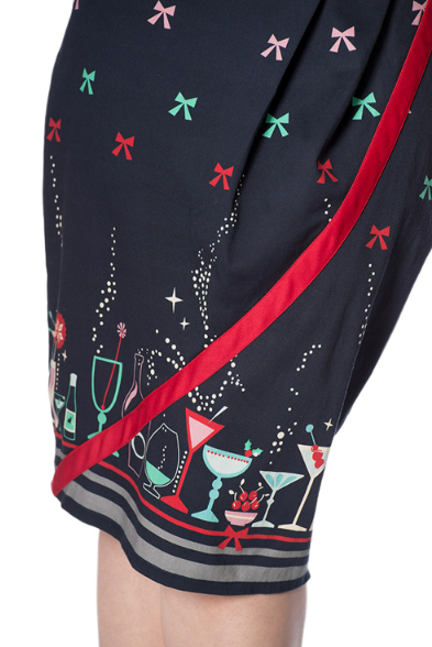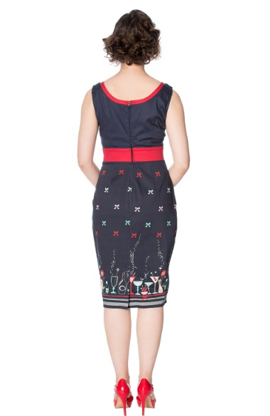 Dámské stylové bavlněné šaty značky Banned, barva modrá navy, retro, rockabilly, pin-up, motiv drinky, mašličky, kvězdičky..... na zádech zip pro snadnější oblékání. Dodává Rockabilly clothing shop www.rocka.cz