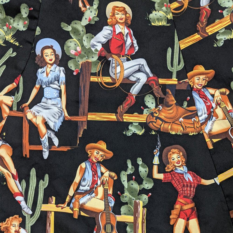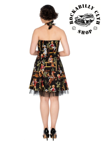 Dámské stylové černé šaty značky Banned, retro, rockabilly, pin-up, motiv kovbojský, cowgirl. Z boku zip pro snadnější oblékání, kapsy, záda elastická. Dodává Rockabilly clothing shop www.rocka.cz