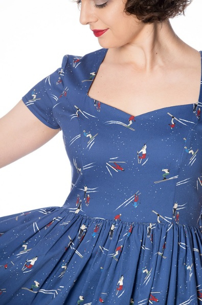 Dámské stylové modré šaty značky Banned, retro, rockabilly, pin-up, motiv zimní, lyžařský, padající sníh..... z boku zip pro snadnější oblékání, vzadu knoflíček.