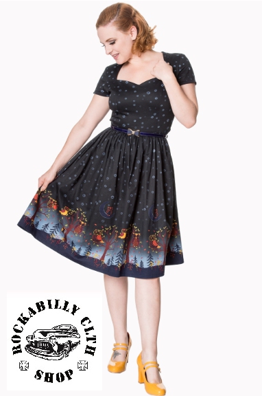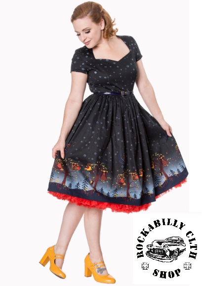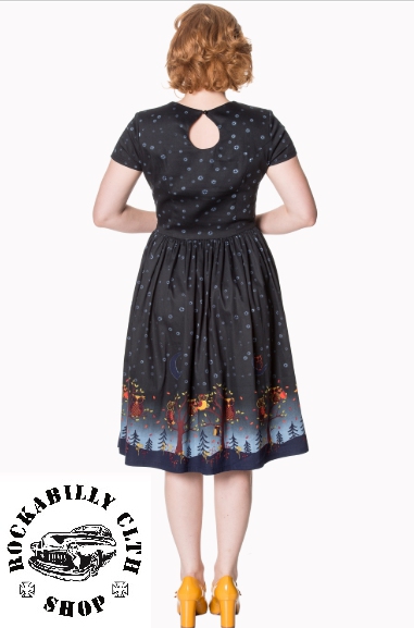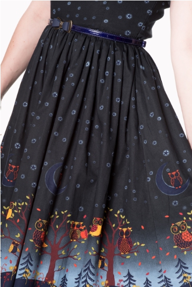 Dámské stylové tmavě modré šaty značky Banned, retro, rockabilly, pin-up, sovy, noční motivy. Z boku zip pro snadnější oblékání, vzadu knoflík. Dodává Rockabilly clothing shop www.rocka.cz