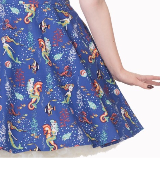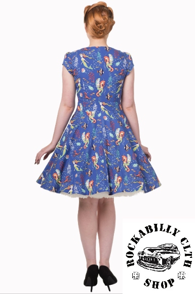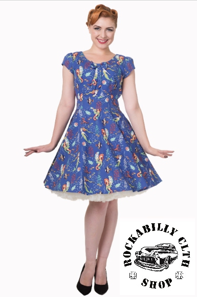 Dámské stylové modré šaty značky Banned, retro, rockabilly, pin-up, mořské motivy. Z boku zip pro snadnější oblékání, vpředu mašle. Dodává Rockabilly clothing shop www.rocka.cz
