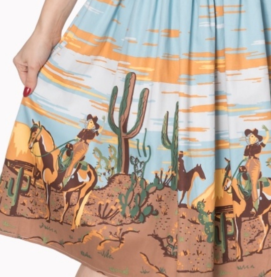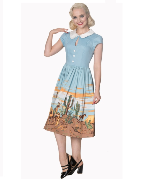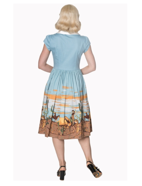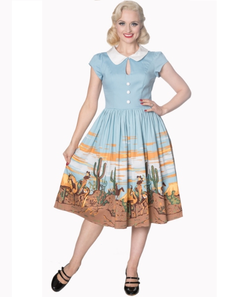 Dámské stylové modré šaty značky Banned, retro, rockabilly, pin-up, motiv svěží, letní, party, kovbojský, cowgirl, koně..... z boku zip pro snadnější oblékání. Dodává Rockabilly clothing shop www.rocka.cz