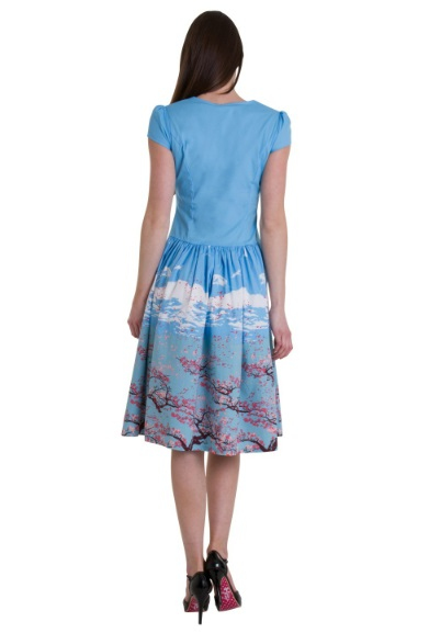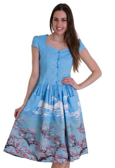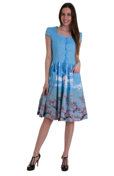 Dámské stylové bavlněné šaty s kapsami značky Banned, barva modrá, retro, rockabilly, pin-up, motiv romantický, hory, rozkvetlé stromy..... ze předu knoflíčky pro snadnější oblékání. Dodává Rockabilly clothing shop www.rocka.cz