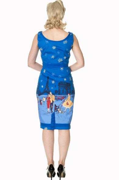 Dámské stylové bavlněné šaty značky Banned, barva modrá, retro, rockabilly, pin-up, motiv romantický, Paříž..... z boku zip pro snadnější oblékání. Dodává Rockabilly clothing shop www.rocka.cz