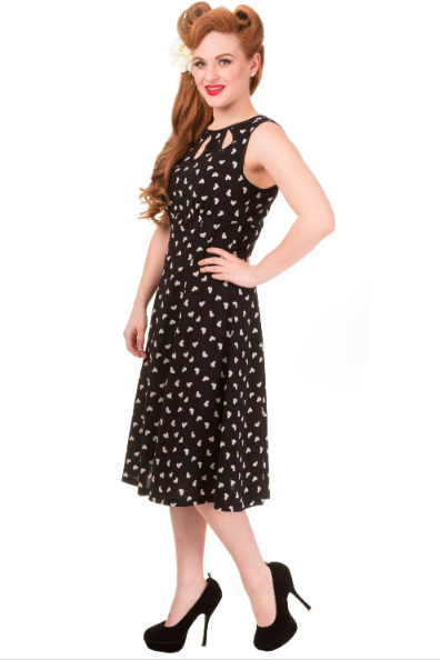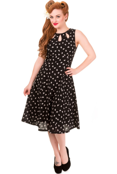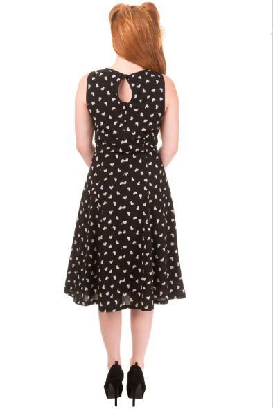 Dámské stylové černé šaty značky Banned, retro, rockabilly, pin-up, motiv srdce jako puntíky ..... vzadu zip pro snadnější oblékání. Dodává Rockabilly clothing shop www.rocka.cz