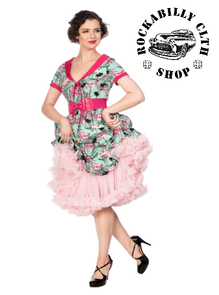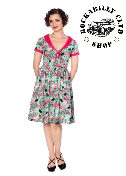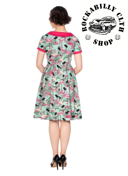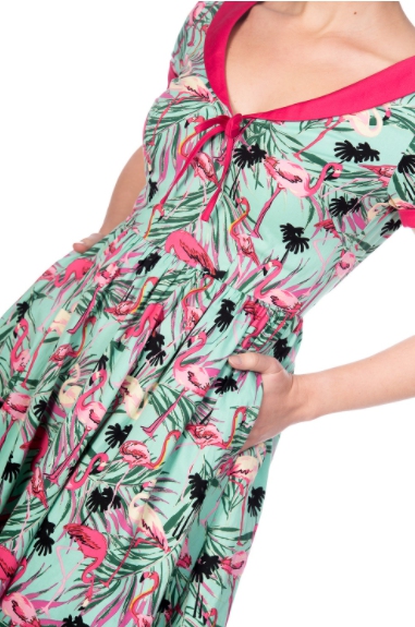 Dámské stylové zeleno růžové šaty značky Banned, retro, rockabilly, pin-up, motiv plameňáci. Vzadu zip pro snadnější oblékání, kapsy z boku. Dodává Rockabilly clothing shop www.rocka.cz