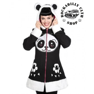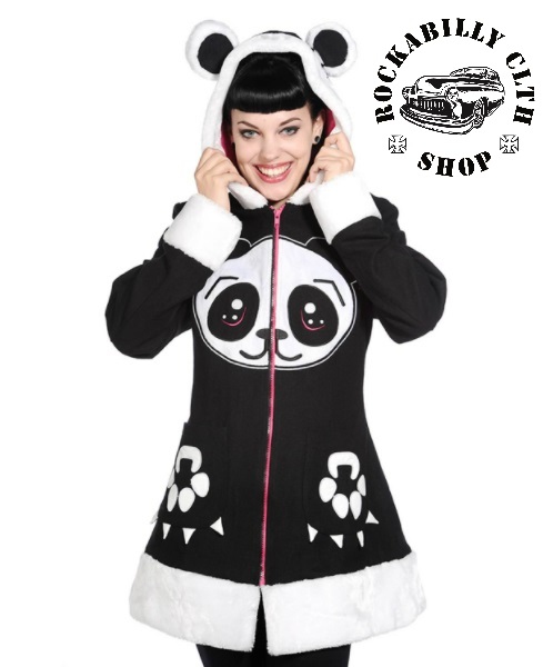 Dámský stylový kabátek značky Banned, retro, rockabilly, pin-up, motiv panda. Ze předu zip, 2 kapsy, záda šněrování, kapuca "panda styl" s ouškama. Dodává Rockabilly clothing shop www.rocka.cz