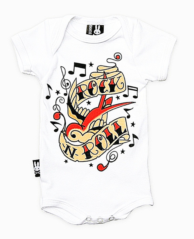 velikost věk 12 měsíců, originální bílé dětské old school body Six Bunnies, dodává Rockabilly Clothing Shop www.rocka.cz, motiv rockabilly, retro, old school, rock´n´roll ...