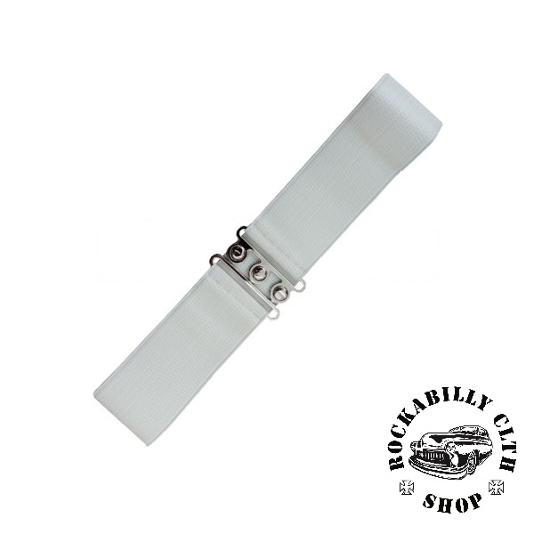Bílý elastický retro pásek od značky Banned, perfektní doplněk k retro / rockabilly šatům, zapínání na tři stříbrné zacvakávací kroužky.