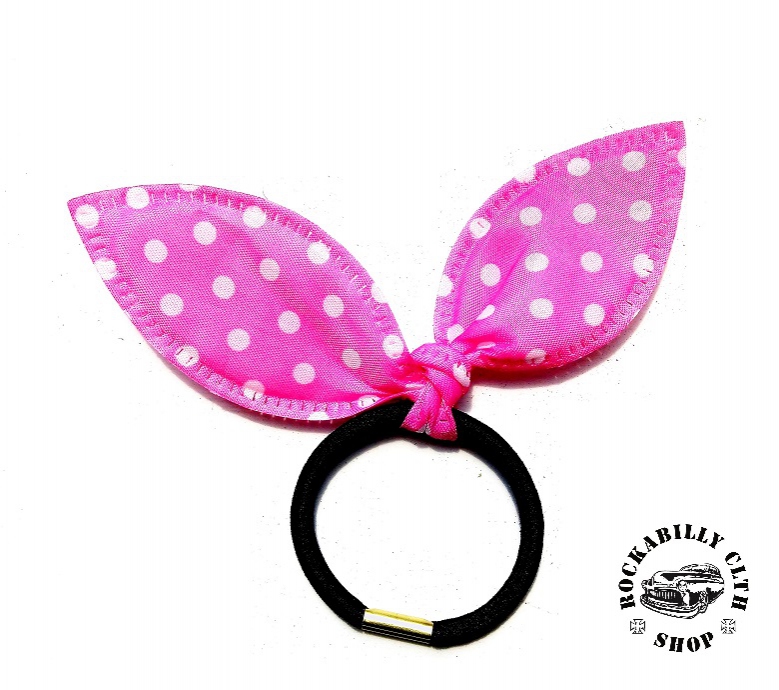 Originální gumička do vlasů, růžová mašlička s puntíkem, skvělý doplněk do vlasů. Dodává Rockabilly Clothing Shop Praha.