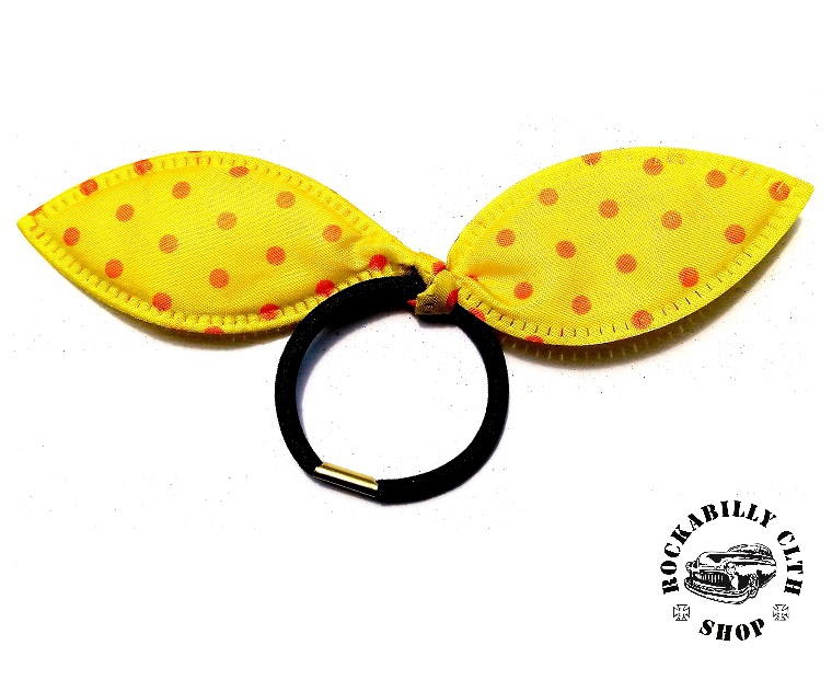Originální gumička do vlasů, žlutá mašlička s puntíkem, skvělý doplněk do vlasů. Dodává Rockabilly Clothing Shop Praha.