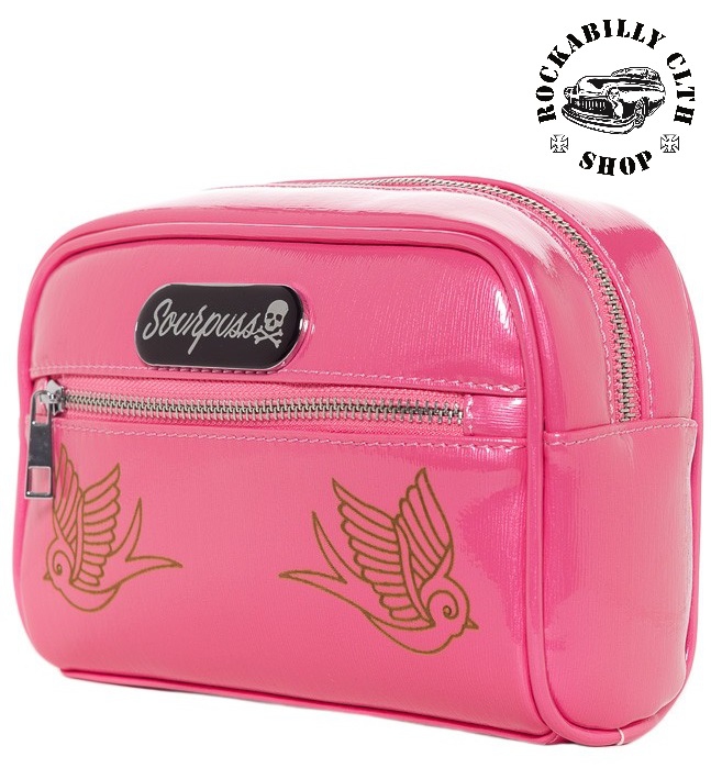 Kosmetická taška z ameriky značky Sourpuss velikost 22 x 15 x 8, lze použít jako doplněk k šatům na párty i jako malou taštičku, dodává Rockabilly Clothing Shop.
