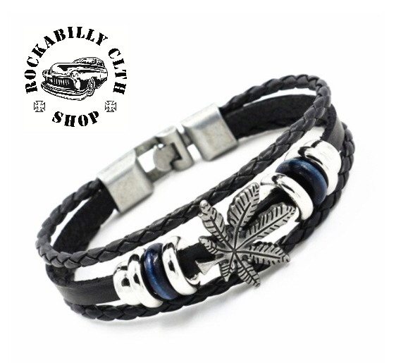 Kožený náramek se zapínáním, motiv cannabis, tráva, ručně vyráběný, parádní doplněk k oblečení. Dodává Rockabilly Clothing Shop www.rocka.cz
