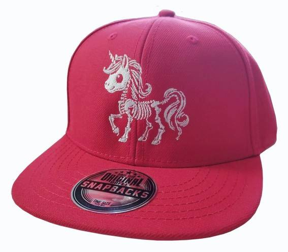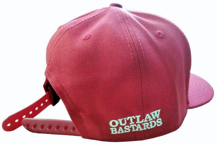 Exkluziv rockabilly - rock´n ´roll - hot rod - kustom červená kšiltovka snapback značky Outlaw Bastards, vzadu zapínání, vpředu výšivka kostra unicorn, jednorožec, vzadu výšivka nápis Outlaw Bastards, dodává Rockabilly Clothing Shop Praha
