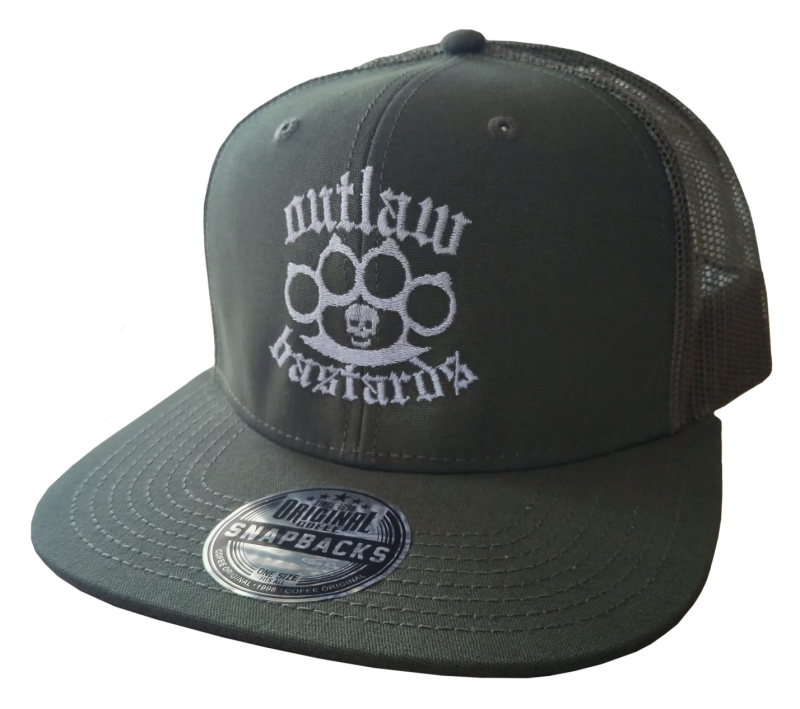 Exkluziv rockabilly - rock´n ´roll - hot rod - kustom kšiltovka snapback značky Outlaw Bastards, vpředu výšivka Outlaw Bastards, vzadu zapínání a síťka, dodává Rockabilly Clothing Shop Praha, barva zelená.