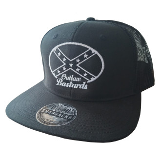 Exkluziv rockabilly - rock´n ´roll - hot rod - kustom kšiltovka snapback značky Outlaw Bastards s jižanskou vlajkou, vpředu výšivka Outlaw Bastards, jižanka, dixie, vzadu zapínání a síťka, dodává Rockabilly Clothing Shop www.rocka.cz, barva černá.