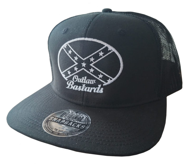 Exkluziv rockabilly - rock´n ´roll - hot rod - kustom kšiltovka snapback značky Outlaw Bastards s jižanskou vlajkou, vpředu výšivka Outlaw Bastards, jižanka, dixie, vzadu zapínání a síťka, dodává Rockabilly Clothing Shop www.rocka.cz, barva černá.