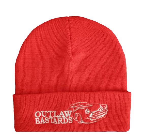 teplá zimní čepice / kulich známé značky Outlaw Bastards, barva červená, vpředu výšivka, motiv rockabilly rock´n´roll hot rod kustom pin-up, dodává Rockabilly Clothing Shop www.rocka.cz