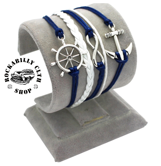 Náramek námořnický modrý, kovové doplňky kotva, kormidlo, lano, parádní doplněk k oblečení. Posuvné zapínání, délka max 22 cm. Dodává Rockabilly Clothing Shop www.rocka.cz