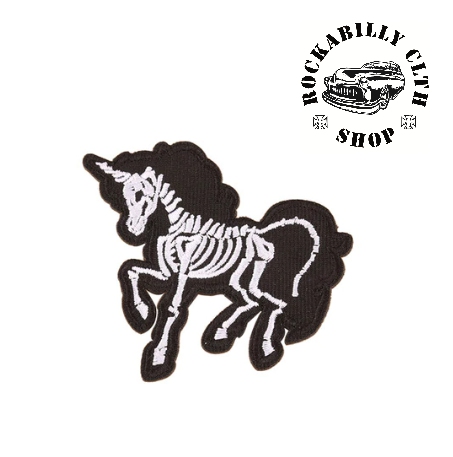 nášivka / nažehlovačka jednorožec, lebka, kostra, rozměry cca: šířka cca 8 cm, výška cca 6,5 cm