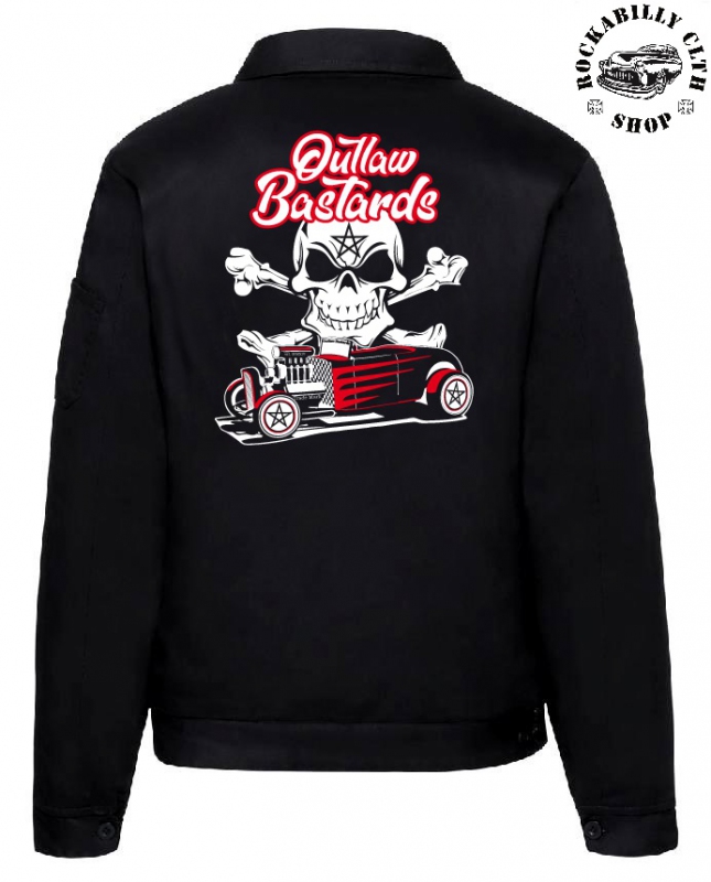 Pánská jarně - podzimní bunda značky Outlaw Bastards s potiskem na zádech a výšivkou vpředu. Složení: 100% bavlna. Motiv hot rod coroner.
