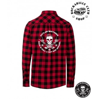 Pánská kostkovaná černo červená jarně-podzimní flanelová košile s dlouhým rukávem, na spodním lemu nášivka Outlaw Bastards, nad kapsou nášité logo Outlaw Bastards, záda kvalitní potisk Outlaw Bastards, 100% bavlna, ideální doplněk ze známé dílny Outlaw Bastards Clothing.