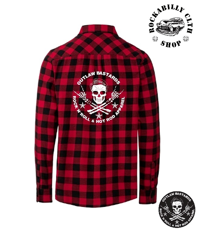 Pánská kostkovaná černo červená jarně-podzimní flanelová košile s dlouhým rukávem, na spodním lemu nášivka Outlaw Bastards, nad kapsou nášité logo Outlaw Bastards, záda kvalitní potisk Outlaw Bastards, 100% bavlna, ideální doplněk ze známé dílny Outlaw Bastards Clothing.