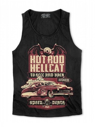 100% bavlněné černé pánské tílko Hotrod Hellcat s kvalitním potiskem, motiv Hotrod Hellcat , hotrod, kustom, motor, rockabilly, punk, dodává Rockabilly clothing shop www.rocka.cz