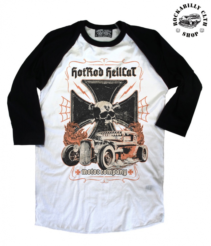 100% bavlněné exkluziv raglan černo bílé rockabilly - rock´n ´roll - hot rod - kustom tričko Hotrod Hellcat, vředu s kvalitním potiskem, dodá Rockabilly Clothing Shop Praha