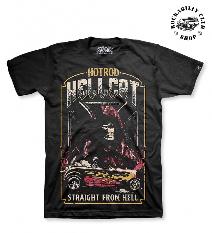 100% bavlněné exkluziv černé rockabilly - rock´n ´roll - hot rod - kustom tričko Hotrod Hellcat, vředu s kvalitním potiskem, dodá Rockabilly Clothing Shop Praha