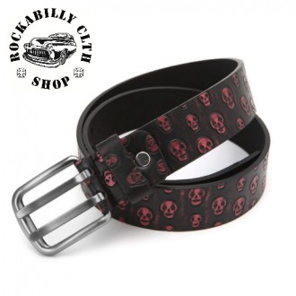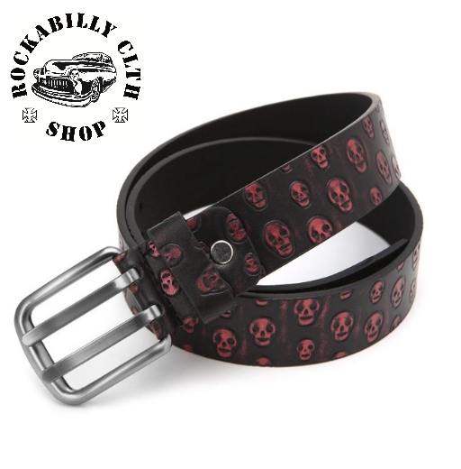 Kožený pásek , umělá kůže, motiv červené lebky, patří ke stylovým doplňkům k oblečení s rockabilly, chopper, punk, hot rod, rat rod a kustom kulture tématikou. Dodává Rockabilly clothing shop www.rocka.cz , délka 113cm.