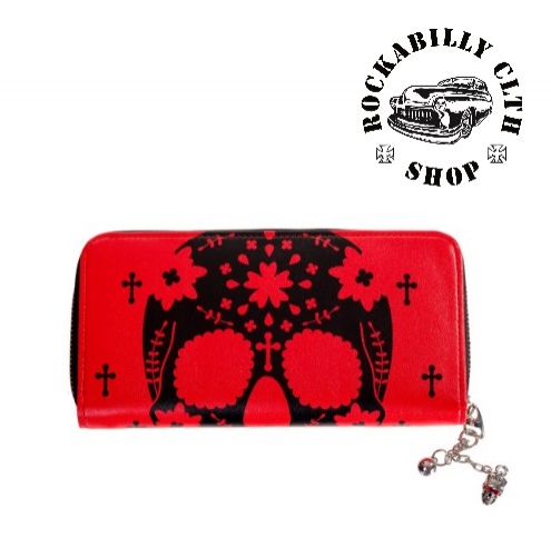 Peněženka červená známé exkluziv značky Banned Apparel, dodá Rockabilly Clotihng Shop Praha. Motiv rockabilly, retro, pin-up, barva červená + lebka. Uvnitř 8x kapsička na kreditky, zapínací kapsa na drobáky, 2 kapsy na papírové bankovky.