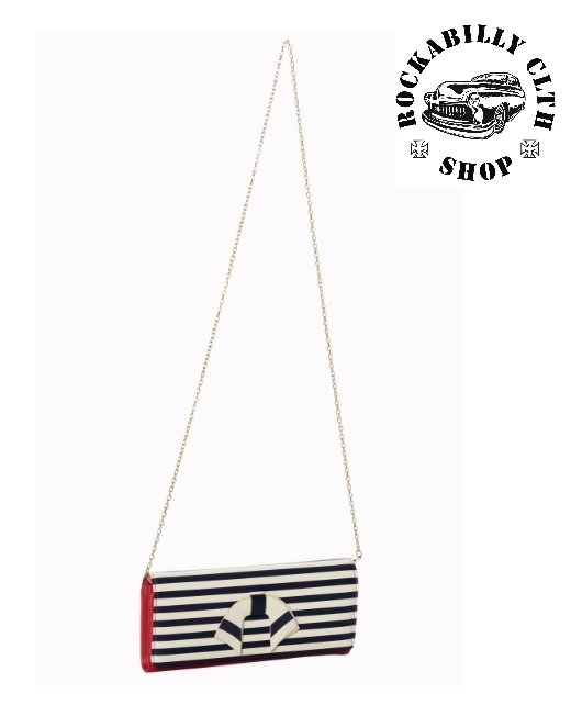 Peněženka / Psaníčko známé exkluziv značky Banned Apparel, dodá Rockabilly Clotihng Shop Praha. Motiv rockabilly, retro, pin-up, barva červená, modrá, bílá, pruhy. Uvnitř 10x kapsička na kreditky, zapínací kapsa na drobáky, 4 kapsy na papírové bankovky. Možno nosit se řetízkem přes rameno, který je součástí balení.