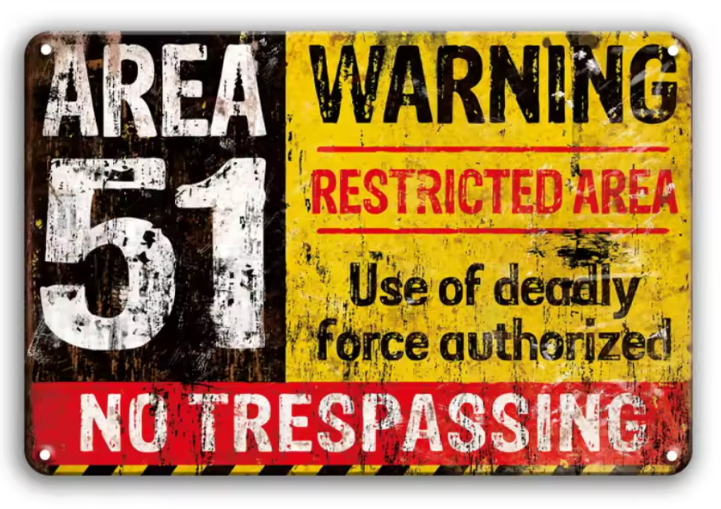 Plechová US cedule s motivem oblasti Area 51 No Trespassing, v každém rohu dírky na upevnění do bytečku, garáže, baru nebo třeba i kanceláře.