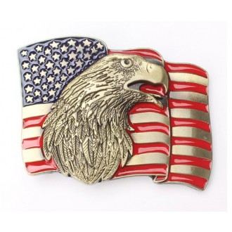 Kovová přezka na pásek americká vlajka, americký orel, USA, patří ke stylovým doplňkům k oblečení s rockabilly, chopper, punk, hot rod, rat rod a kustom kulture tématikou. Kovová výměnná přezka určená pro pásky přizpůsobené pro tento účel, přezka je opatřená poutkem a zapínacím kolíkem.