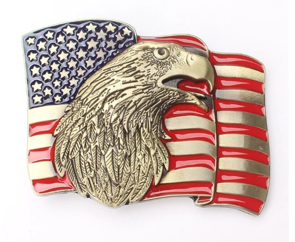 Kovová přezka na pásek americká vlajka, americký orel, USA, patří ke stylovým doplňkům k oblečení s rockabilly, chopper, punk, hot rod, rat rod a kustom kulture tématikou. Kovová výměnná přezka určená pro pásky přizpůsobené pro tento účel, přezka je opatřená poutkem a zapínacím kolíkem.