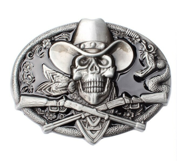 Kovová přezka na pásek western lebka, cowboy, patří ke stylovým doplňkům k oblečení s rockabilly, chopper, punk, hot rod, rat rod a kustom kulture tématikou. Kovová výměnná přezka určená pro pásky přizpůsobené pro tento účel, přezka je opatřená poutkem a zapínacím kolíkem.