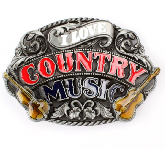 Kovová přezka na pásek music, love country, patří ke stylovým doplňkům k oblečení s rockabilly, chopper, punk, hot rod, rat rod a kustom kulture tématikou. Kovová výměnná přezka určená pro pásky přizpůsobené pro tento účel, přezka je opatřená poutkem a zapínacím kolíkem.
