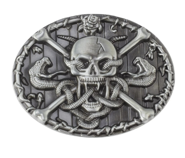Kovová přezka na pásek růže, lebka, hadí motiv, horror, patří ke stylovým doplňkům k oblečení s rockabilly, chopper, punk, hot rod, rat rod a kustom kulture tématikou. Kovová výměnná přezka určená pro pásky přizpůsobené pro tento účel, přezka je opatřená poutkem a zapínacím kolíkem.